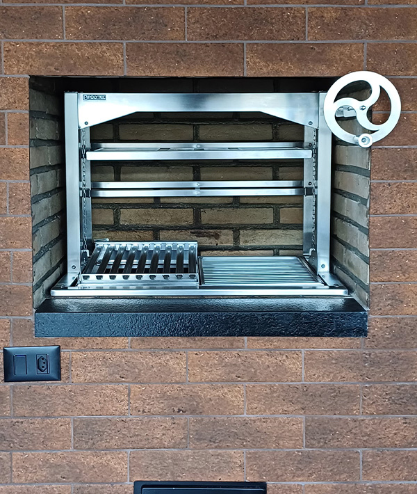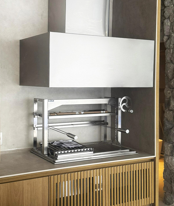 Suporte para Churrasqueira com elevação de grelhas por VOLANTE MINIMALISTA Frontal ANTI-REVERSE.