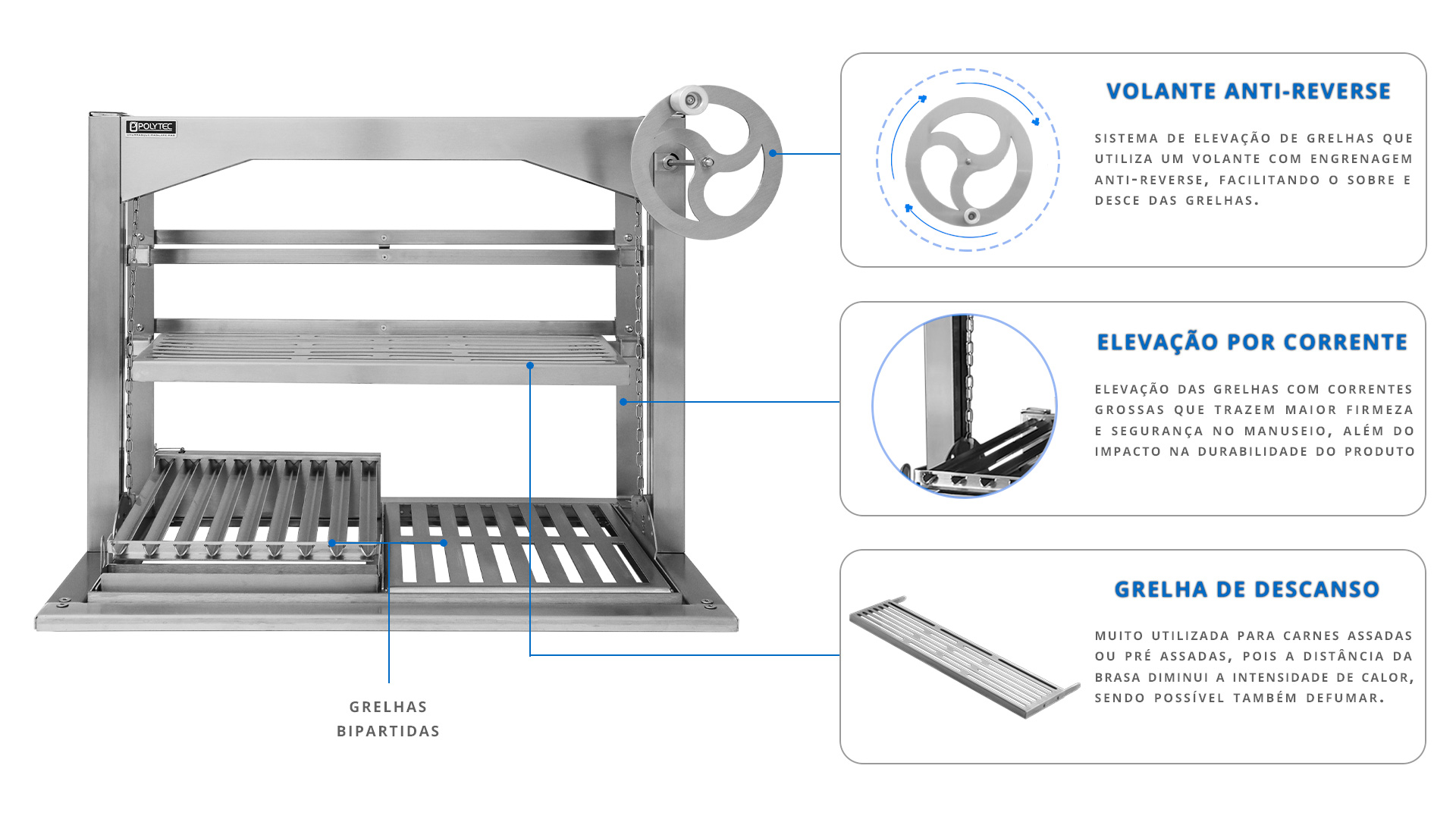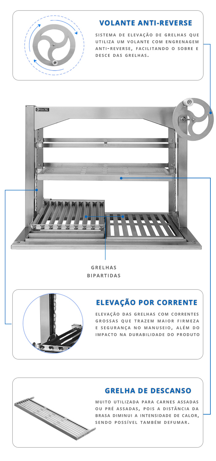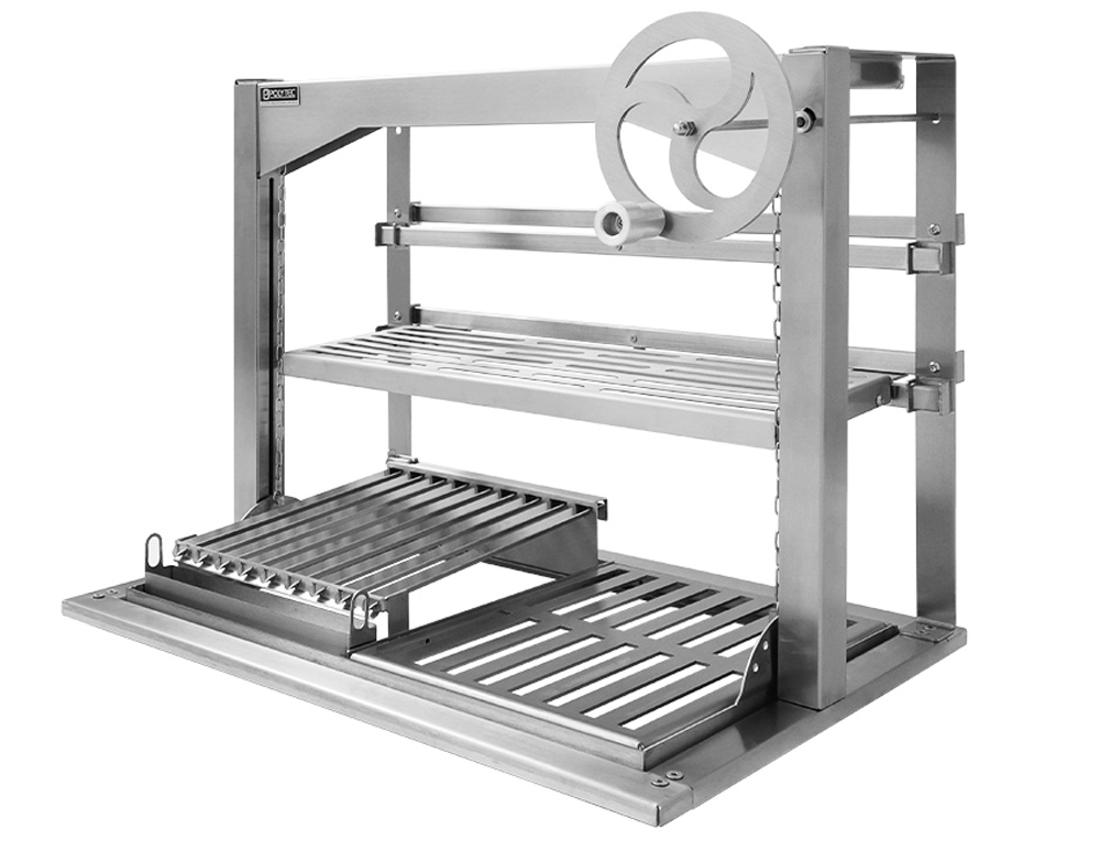 Suporte para Churrasqueira com elevação de grelhas por VOLANTE MINIMALISTA Frontal ANTI-REVERSE.