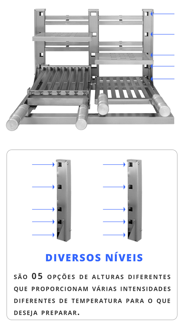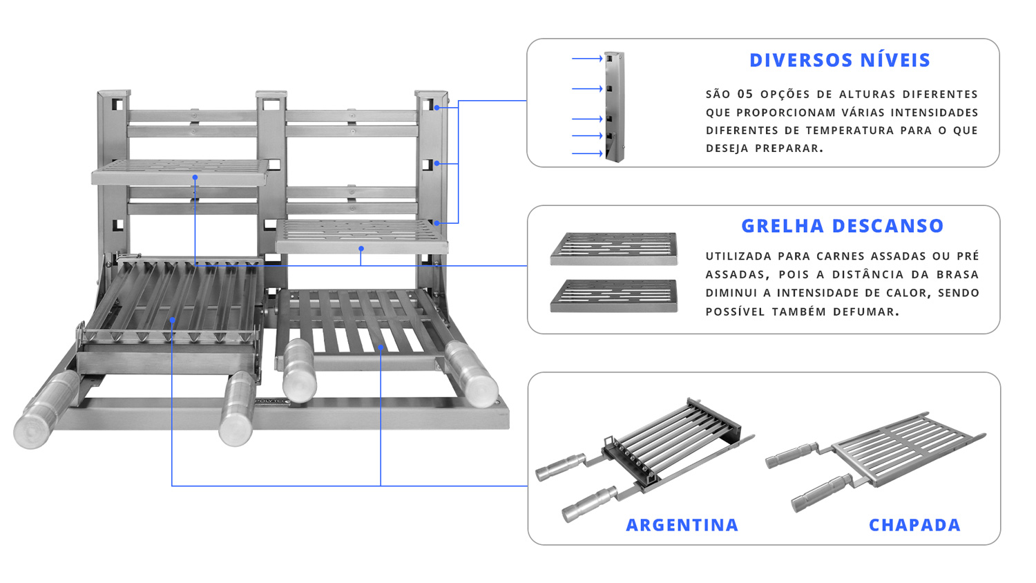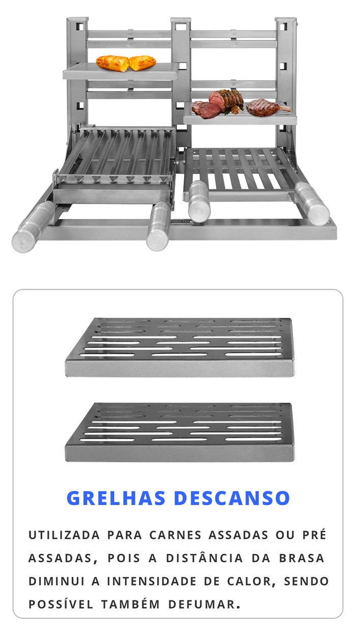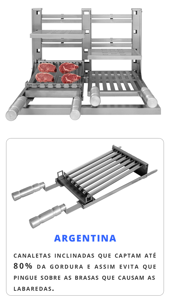 Parrilla inteira em AÇO INOX 304 (Legítimo) – estrutura, grelhas, correntes e tudo mais. Conta com um sistema  Tradicional dc grelhas soltas com Cabo, nosso Grill PolyGrill .