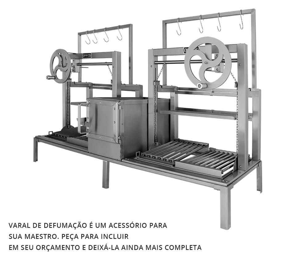 Parrilla inteira em AÇO INOX 304 (Legítimo) – estrutura, grelhas, correntes e tudo mais. Elevação da grelha por VOLANTE ANTI-REVERSE do Grill modelo Maximus.